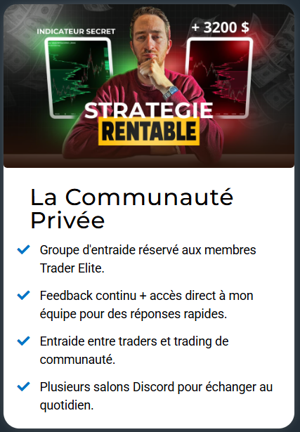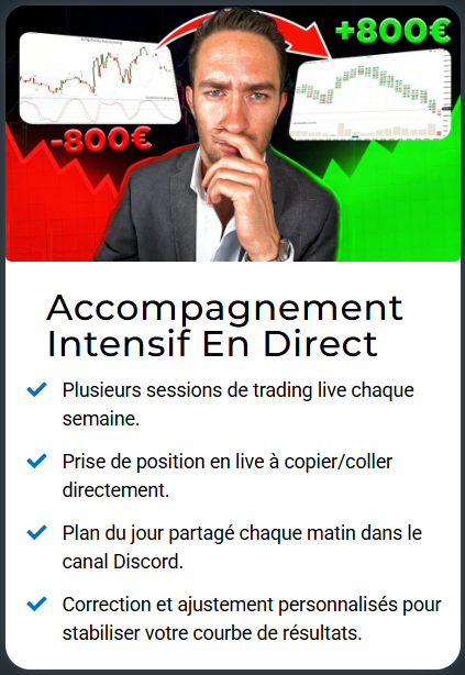 Une fois par semaine, j'organise une session de coaching pendant laquelle je trade devant vous pour vous illustrer mes méthodes et je réponds à toutes vos questions. Vous avez aussi accès à un groupe discord dans lequel toute une communauté vous soutiendra.