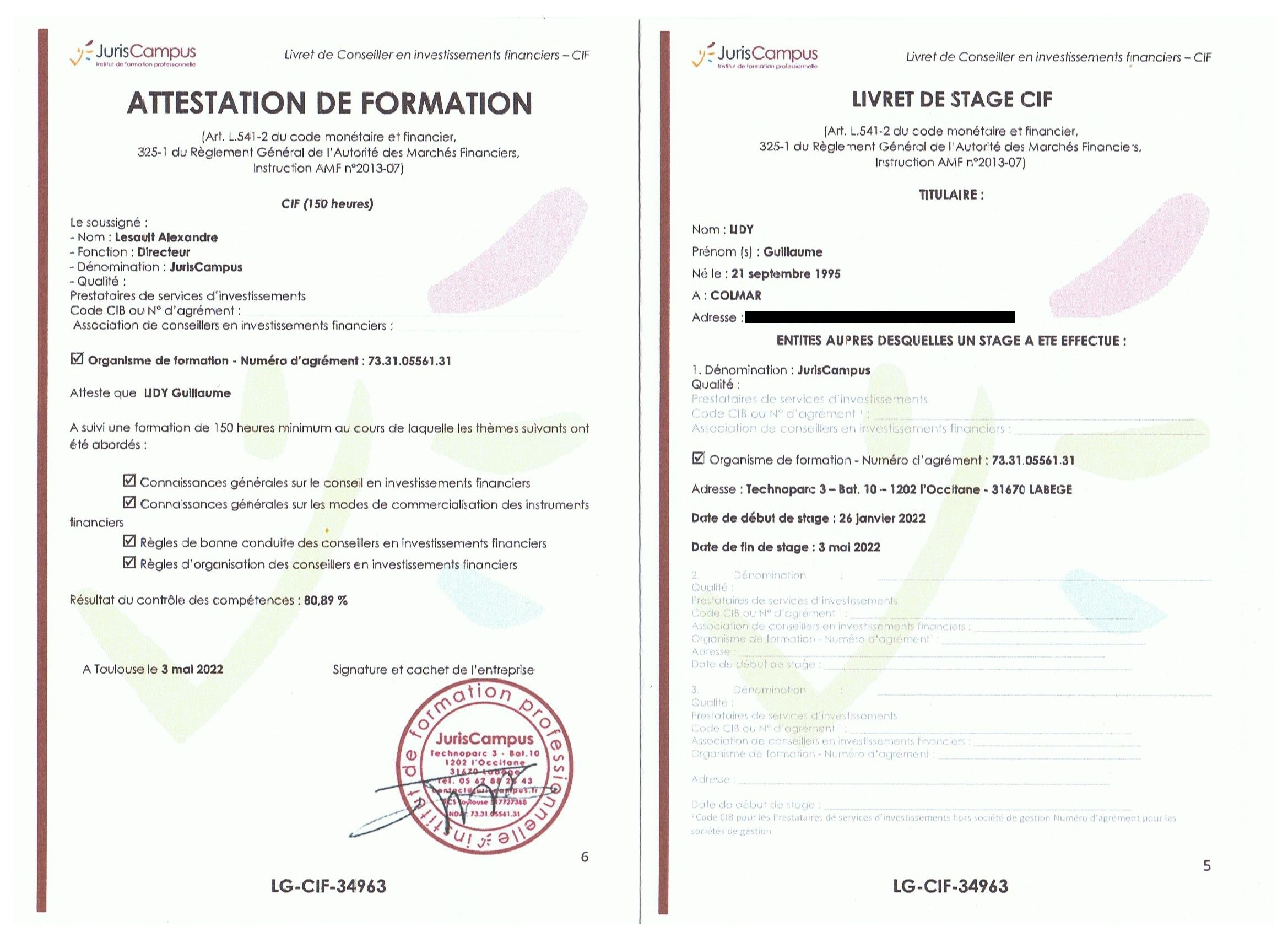 ​Titulaire du livret CIF : ( Conseillé en Investissement Financier )