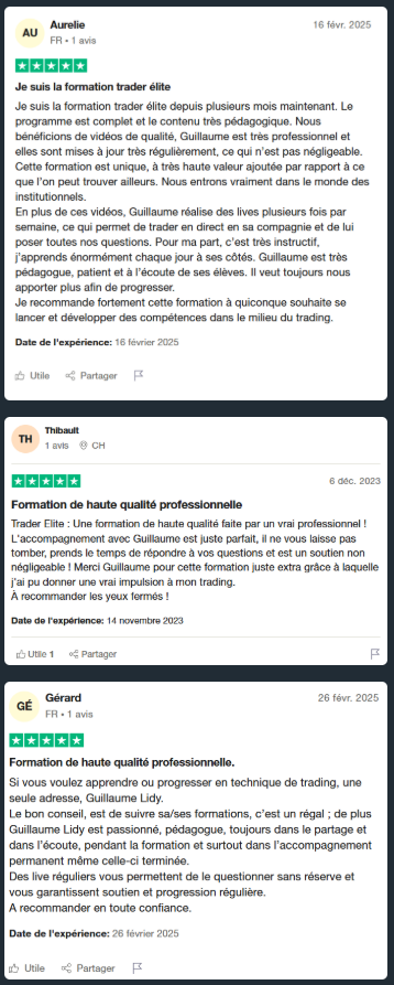Trader Elite a conquis beaucoup de trader. Loin des fausses promesses, des vendeurs de rêve, de ceux qui se disent trader mais qui ne trade jamais devant toi, qui justifie ton échec par ta mauvaise psychologie, et qui t'explique ce qu'il fallait faire. ​Ici, c'est du concret en temps réel !